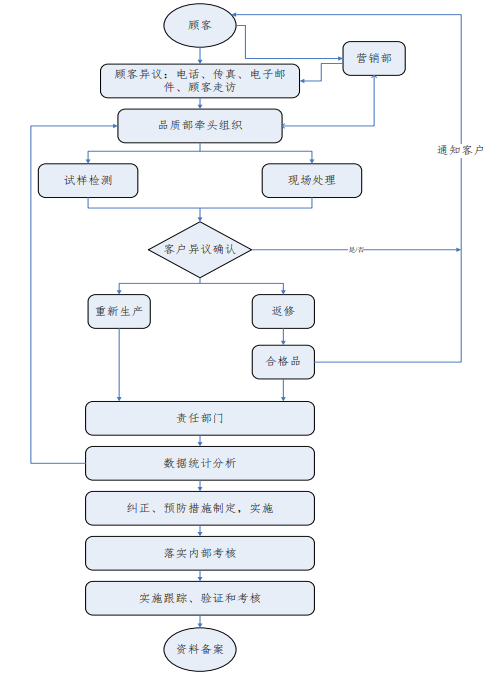 投訴的處理流程:銷售部負(fù)責(zé)收集客戶信息,接收和處理客戶的投訴,流程見圖6.1投訴管理流程。品質(zhì)部的職責(zé)是:客戶質(zhì)量投訴、三包索賠、外部退/換貨接收處理;業(yè)務(wù)員外部質(zhì)量處理支持、重大售后服務(wù)的組織與落實(shí);協(xié)助業(yè)務(wù)員做好質(zhì)量信息的處理回復(fù);客戶質(zhì)量要求識(shí)別輸入與管理;與公司品質(zhì)部等職能部門接口做好售后服務(wù)工作;外部質(zhì)量運(yùn)行、客戶質(zhì)量滿意度分析與組織改善等。最大限度減少顧客不滿和業(yè)務(wù)流失。